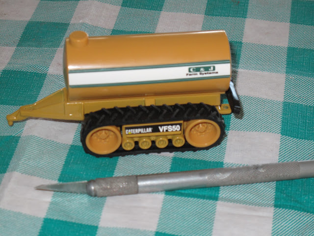 This little model began life as a toy plough, purchased from a local hobby shop for a few dollars after I saw some kind of potential in the design, as well as the fact that the caterpillar tracks actually worked which was very appealing. With the addition of a 1/72 scale helicopter nose and some engines from an old Concorde aircraft, along with a number of other detail pieces, I had what I was after - a tracked vehicle capable of towing duties around a busy airport. The trailer came from another small military toy and the load it's carrying is a simple cylinder ("Star Wars: Phantom Menace" Pod Racer?) with wheel halves added to the ends and extra kit detail to various areas. One of my favourite colours, Venus Orange, was used on the model, along with generic decals, pinstriping tape and handpainted details. All in all, a very quick and enjoyable build! (And the caterpillar tracks still work too!)